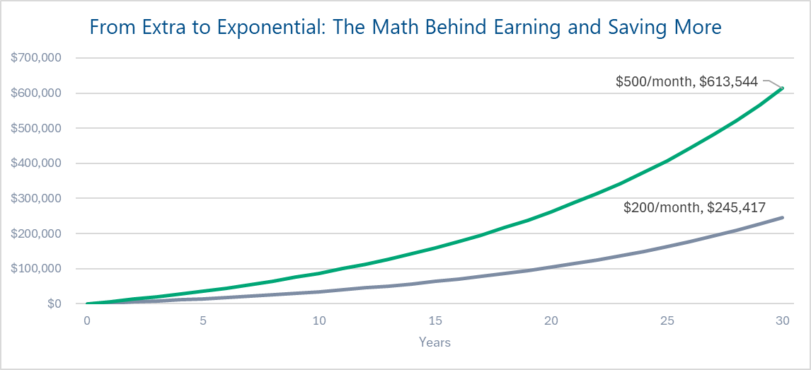 Let's take look at what investing $200/month vs. $500/month looks like: