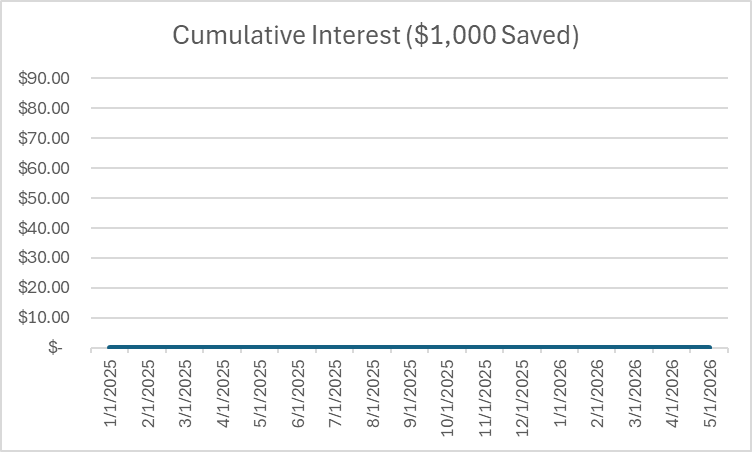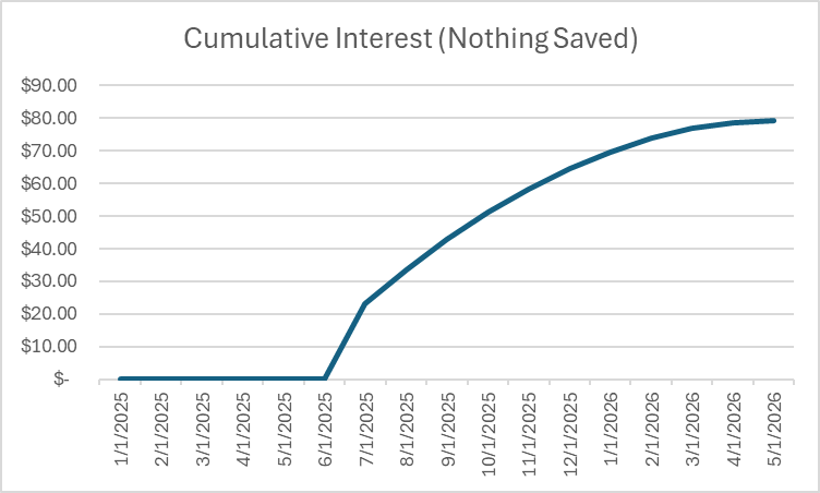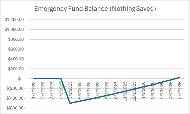 In this case it will take you until May of 2026 (12 months!) just to pay off your $500 emergency and you will have paid nearly $80 in interest to the bank. That puts you nearly an additional 2 months behind on your savings with the $50 per month assumption, while still being exposed to the possibility of another emergency.